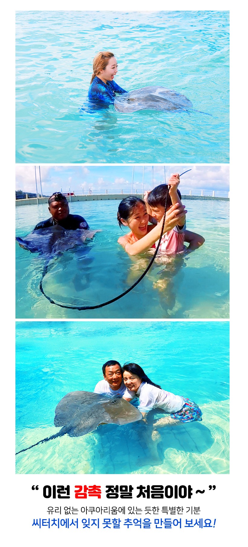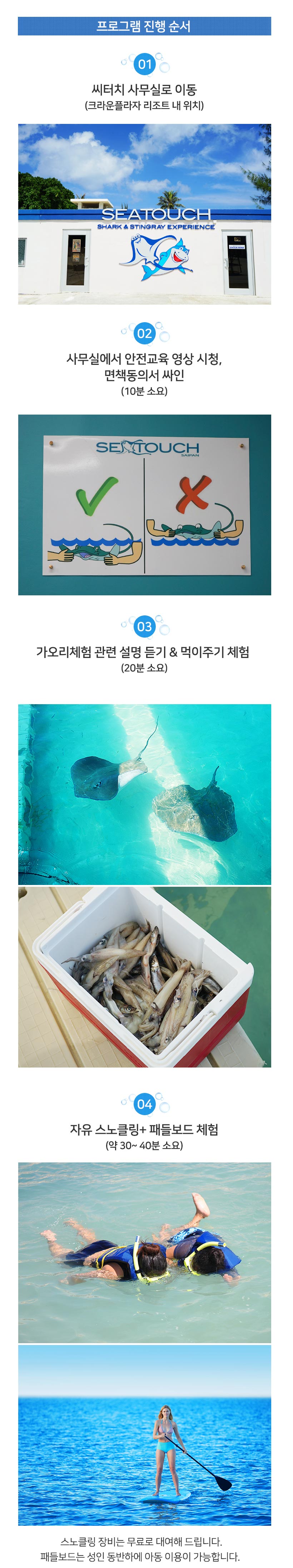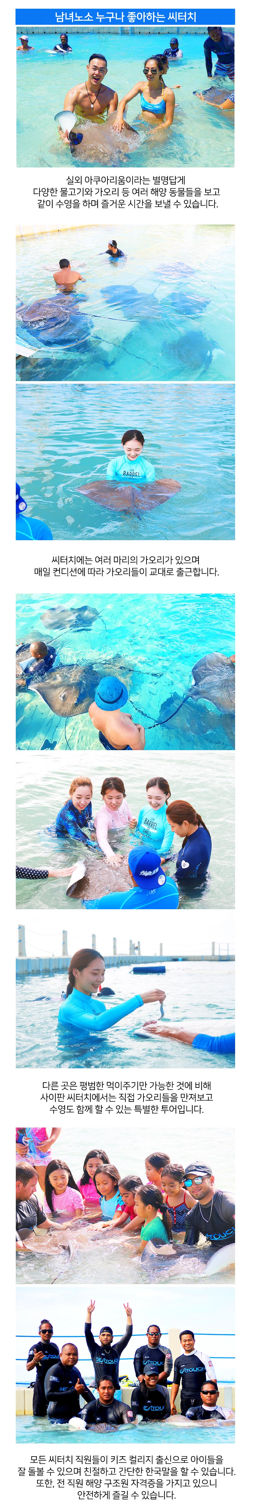 씨터치 직원분들 모두 친절 하시고 전문가에요~ 가오리에 대한 설명과 주의사항에 대한 동영상 시청후 가오리를 만나러 갔는데 가오리도 만져보고, 먹이주고 스노클링도 합니다!