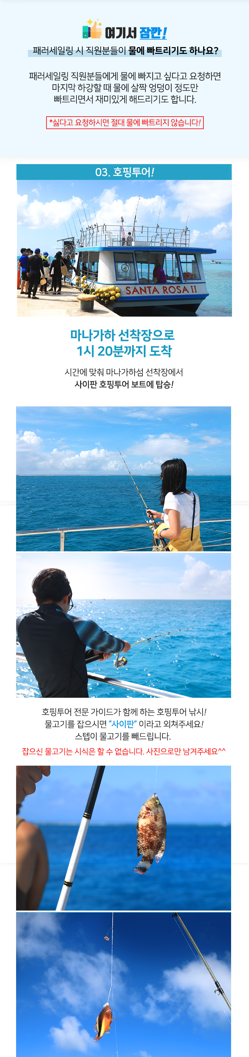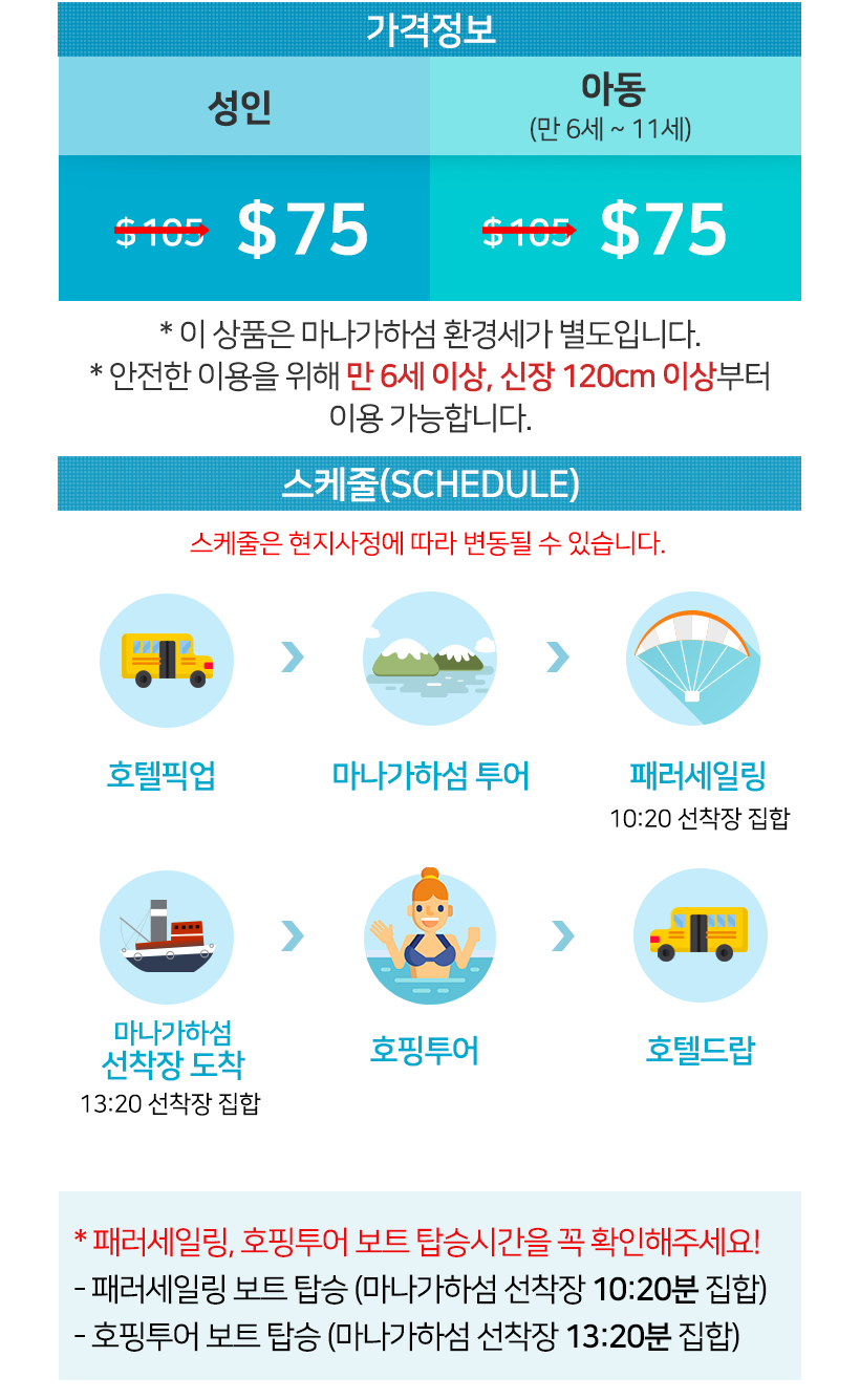 * 패러세일링은 마나가하섬 도착 후 10:20AM 부둣가에서 미팅 후 이용 합니다. 호핑투어는 13:15PM 부둣가로 다시 나와 이용해주시면 됩니다.