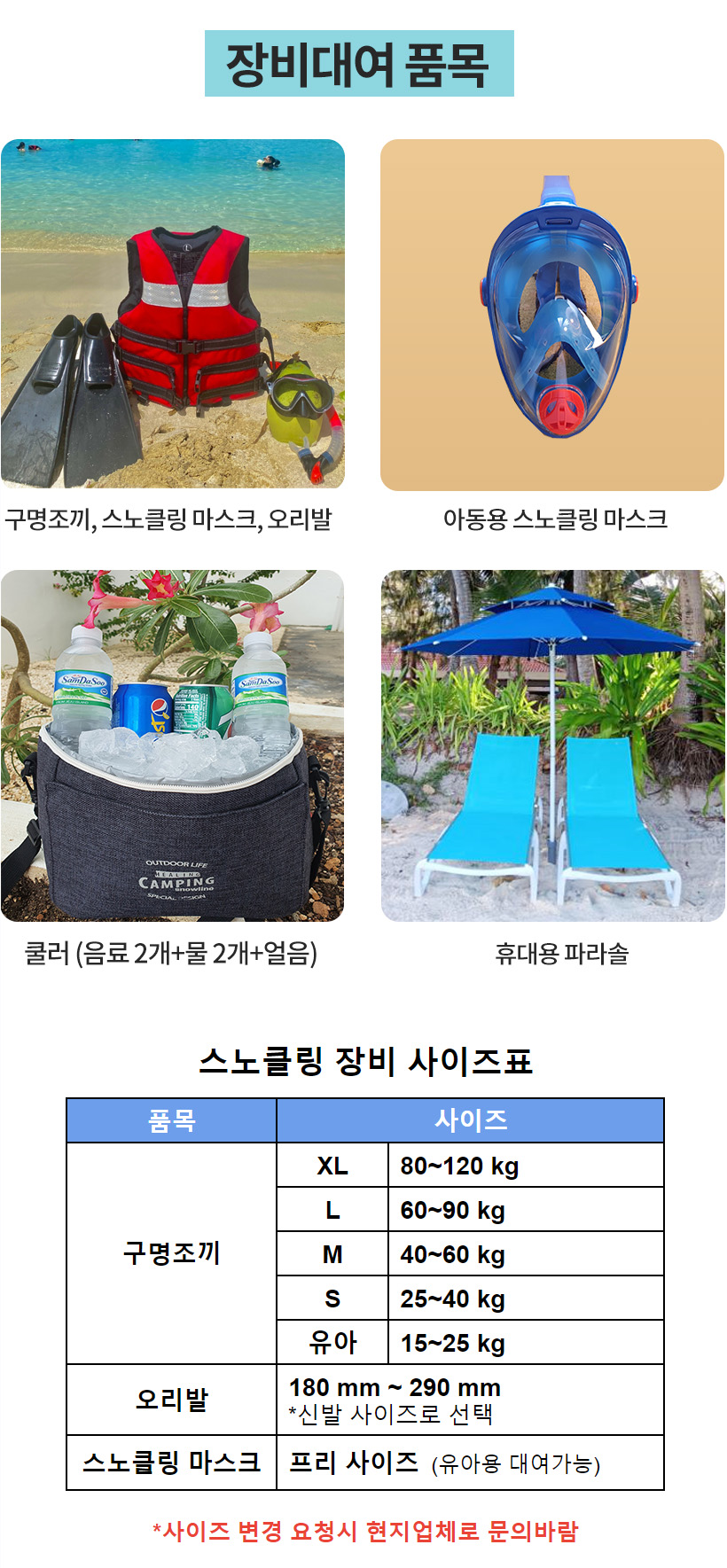 - 해당 옵션을 진행하는 안전 장비 (구명조끼)를 반드시 착용하며 안전요원의 보호 없이 바다 뛰어드는 행위 금지 합니다.
