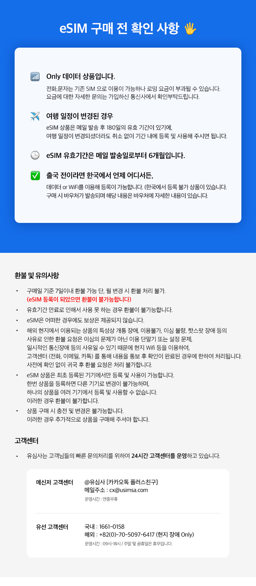 - 해외 현지에서 이용되는 상품의 특성상 개통 장애, 이용불가, 이심 불량, 핫스팟 장애 등의 사유로 인한 환불 요청은 이심의 문제가 아닌 이용 단말기 또는 설정 문제, 일시적인 통신장애 등의 사유일 수 있기 때문에 현지 Wifi 등을 이용하여, 고객센터 (전화, 이메일, 카톡)를 통해 내용을 통보 후 확인이 완료된 경우에 한하여 처리됩니다. 사전에 확인 없이 귀국 후 환불 요청은 처리 불가합니다.