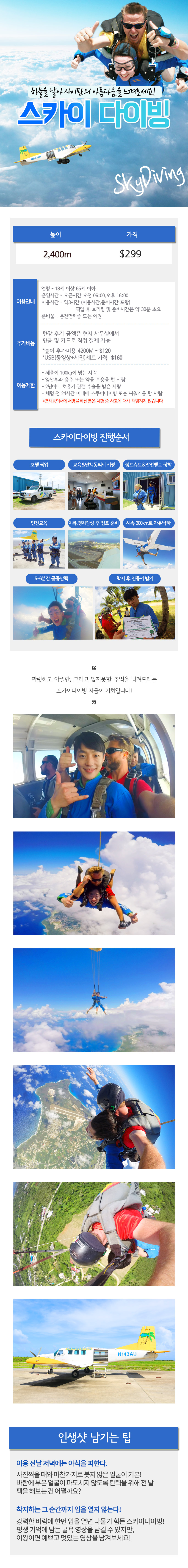 - 스카이다이빙을 체험하기 24시간 이내에는 스쿠버다이빙,씨워커를 삼가 해주세요.