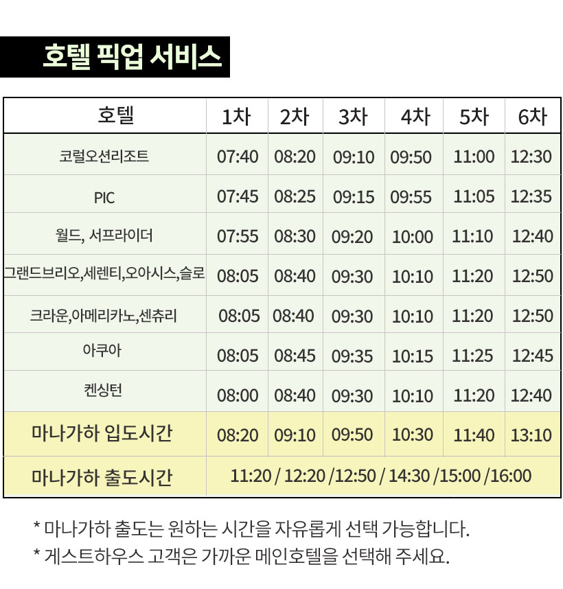 마나가하 입도  08:20 / 09:10 / 09:50 / 10:30 / 11:40/ 13:10