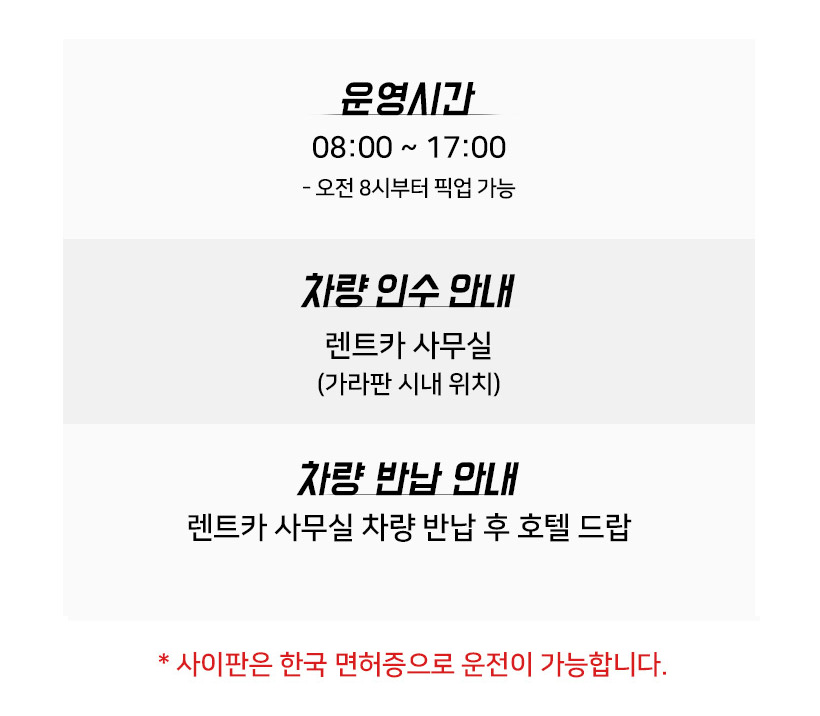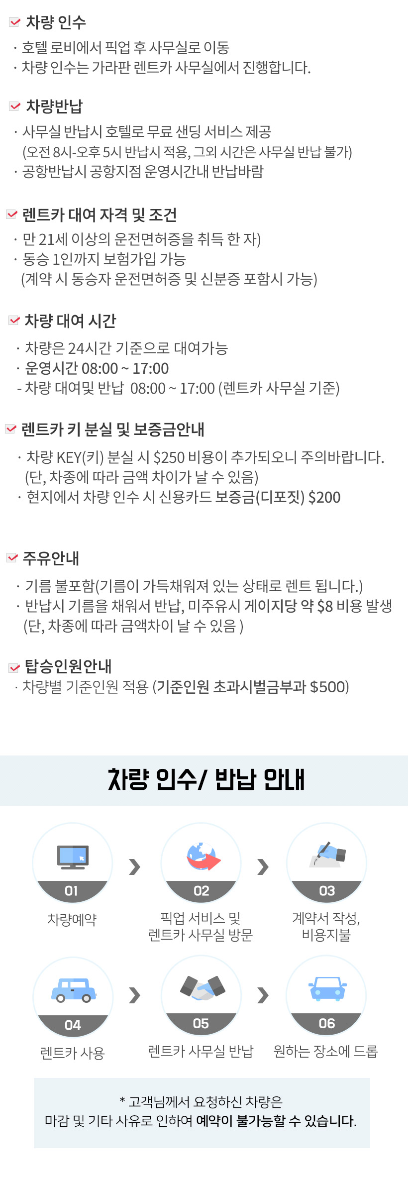 - 변경은 이용일기준 3일전까지 1회만 가능하며, 현지사정에 따라 변경이 불가할 수 있습니다.