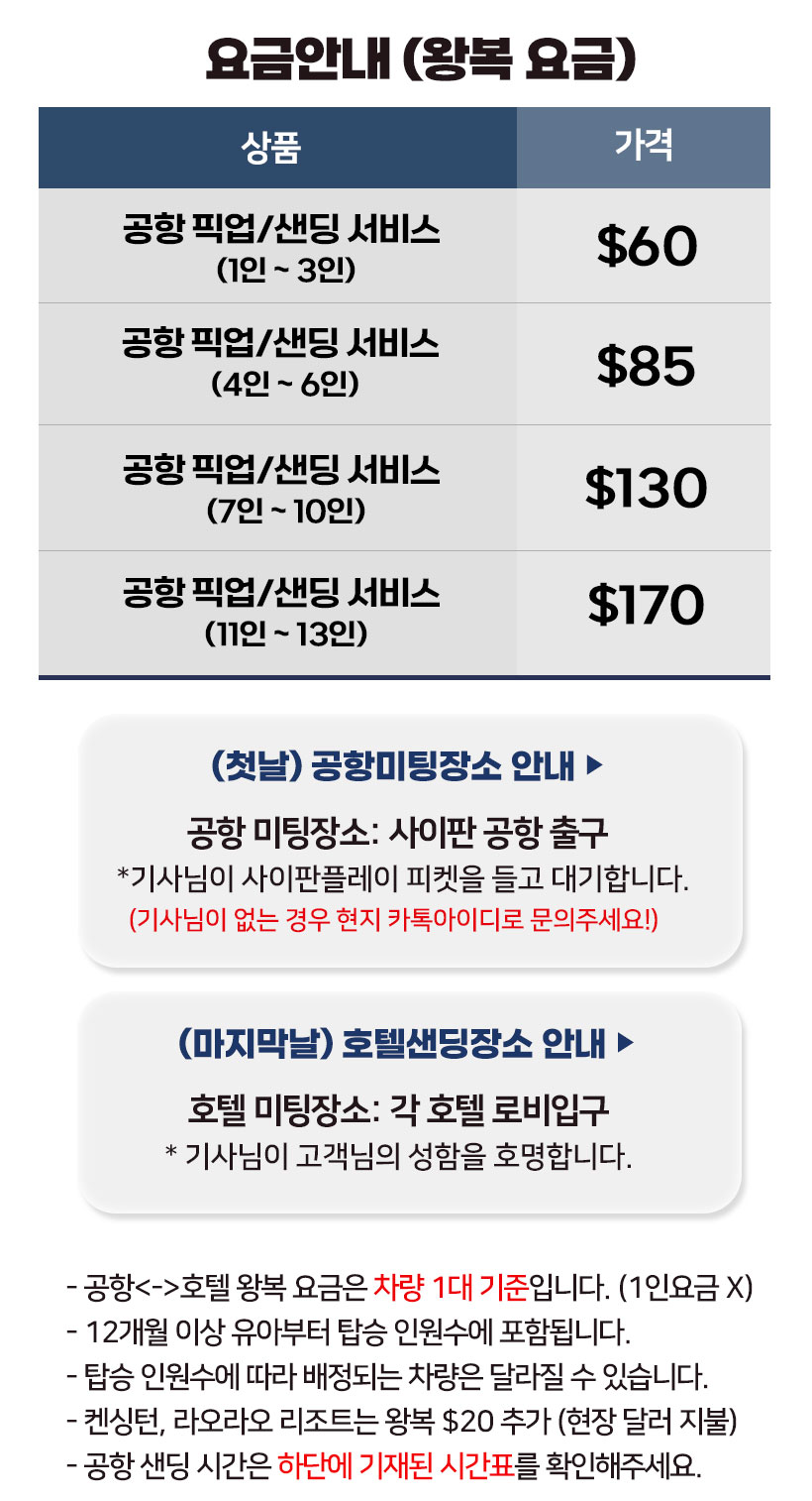 *왕복 픽업/샌딩 비용은 차량 1대 금액 기준입니다. (1인당 금액x)