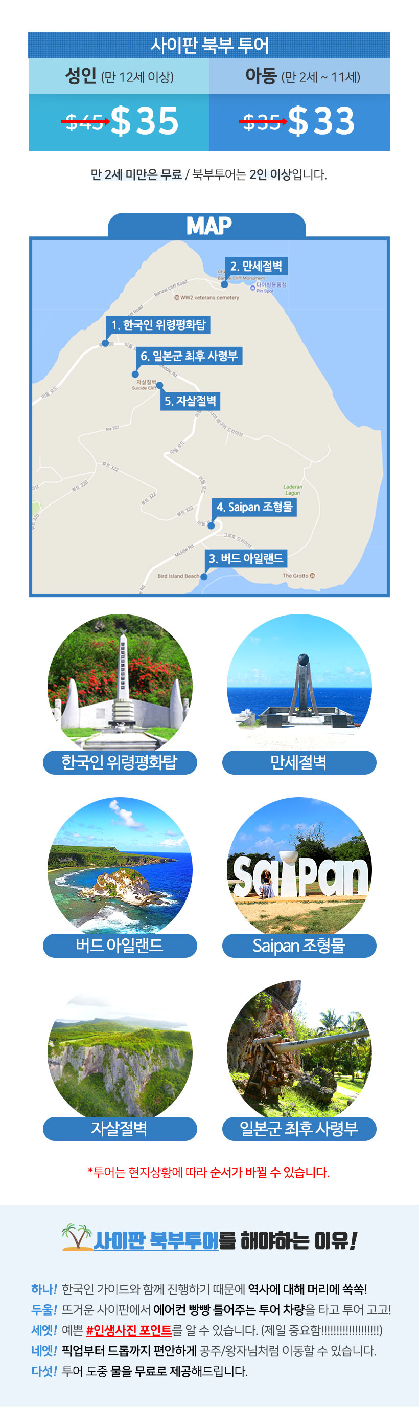 북부투어는 사이판 여행의 필수 관광으로 사이판의 역사를 제대로 들을 수 있는 투어입니다.