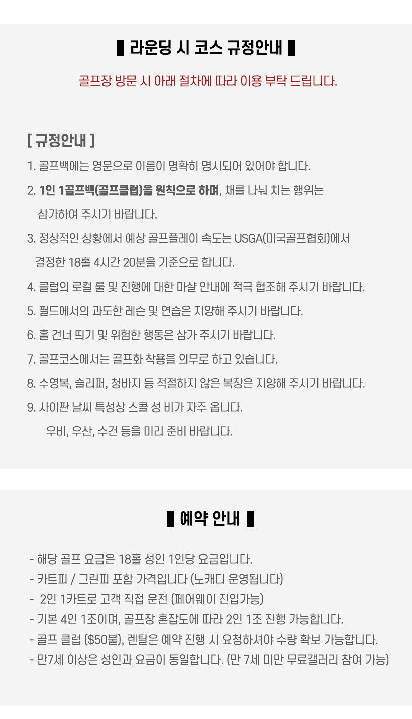 - 골프백 대여 $10 (라운딩 시 1인1골프백으로 플레이 가능합니다) / 비 투숙객 $20