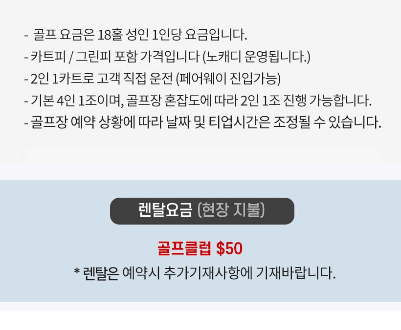 - 클럽 대여는 예약 당시 가능여부 확인 필요하며, $50 / 1회 의 비용이 부과됩니다.