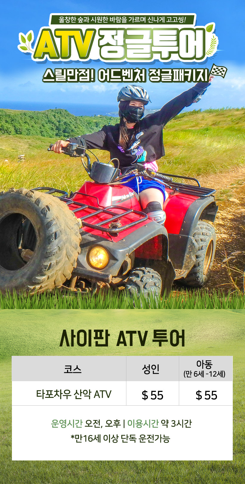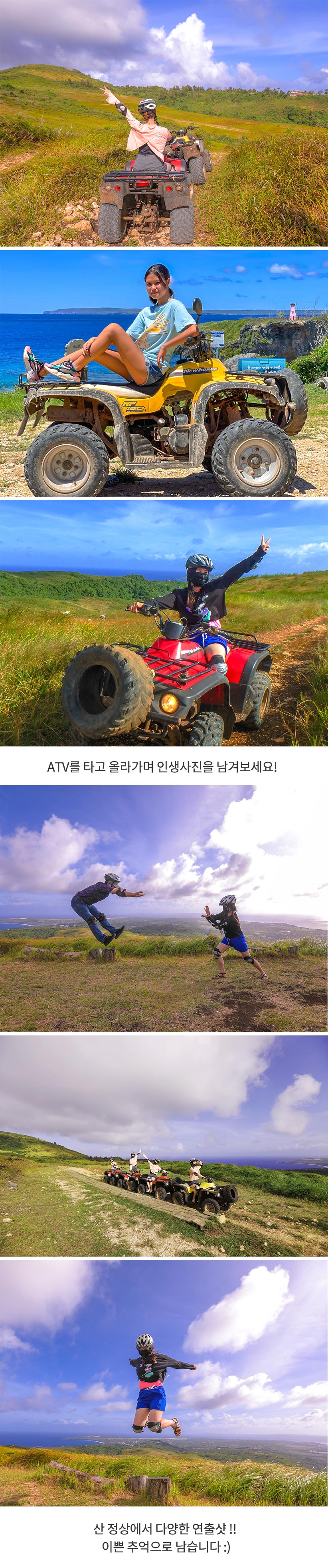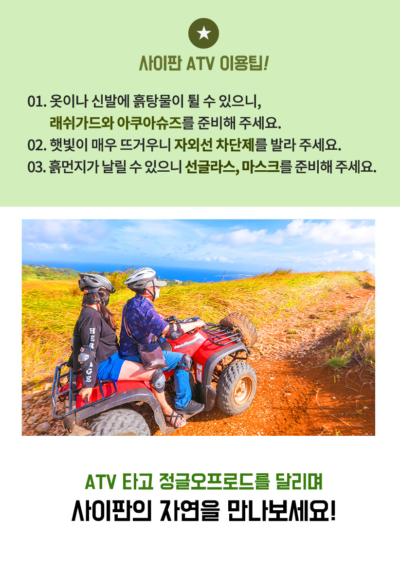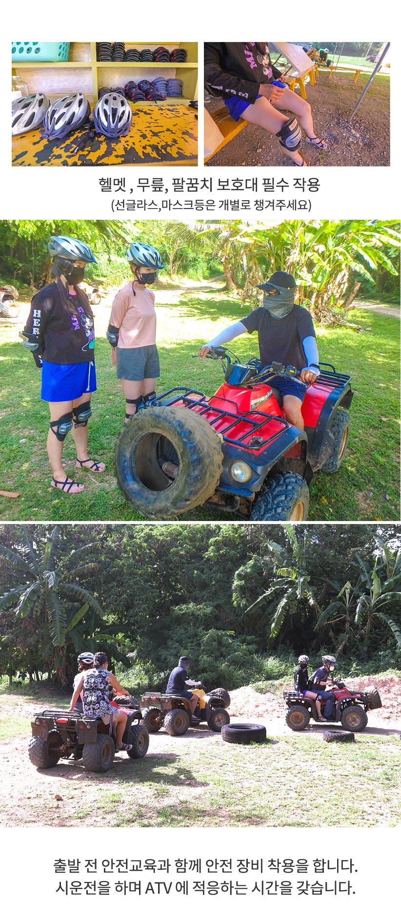 - ATV 운행시 전장비를 착용해야 하며, 현지 직원의 안내에 따라 안전 수칙을 지켜주세요.