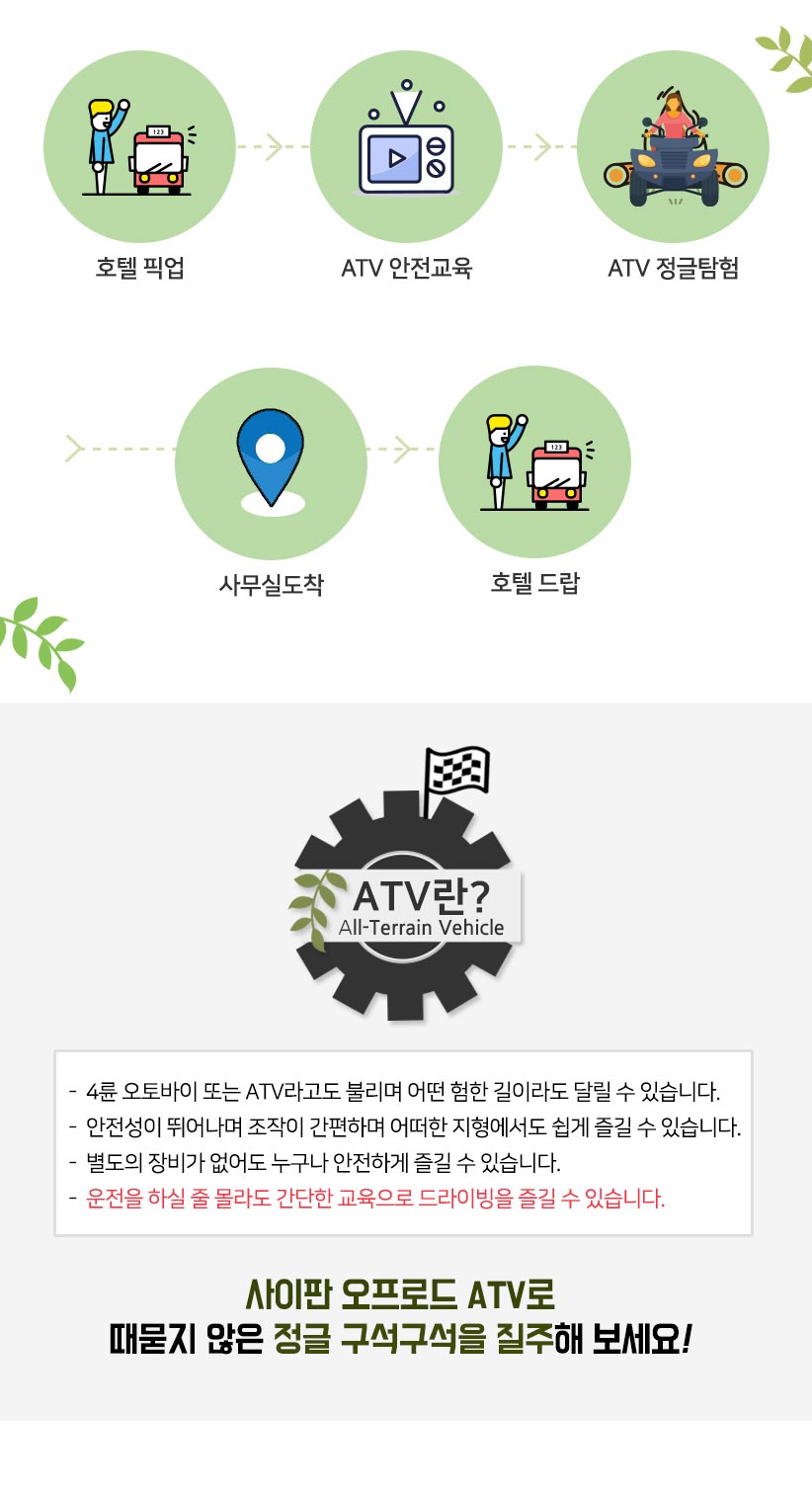 - 모든 ATV 코스는 임산부는 예약이 불가능합니다. 문제 발생시 자사는 책임지지 않습니다.