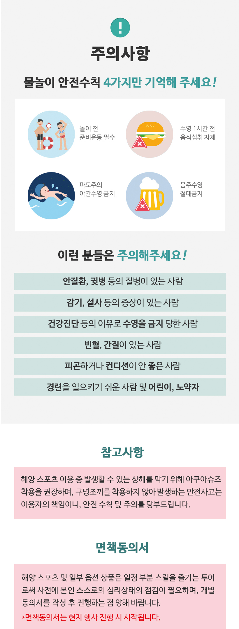 - 안전 장비 (구명조끼)를 반드시 착용하며 안전요원의 보호 없이 바다 뛰어드는 행위 금지 합니다.