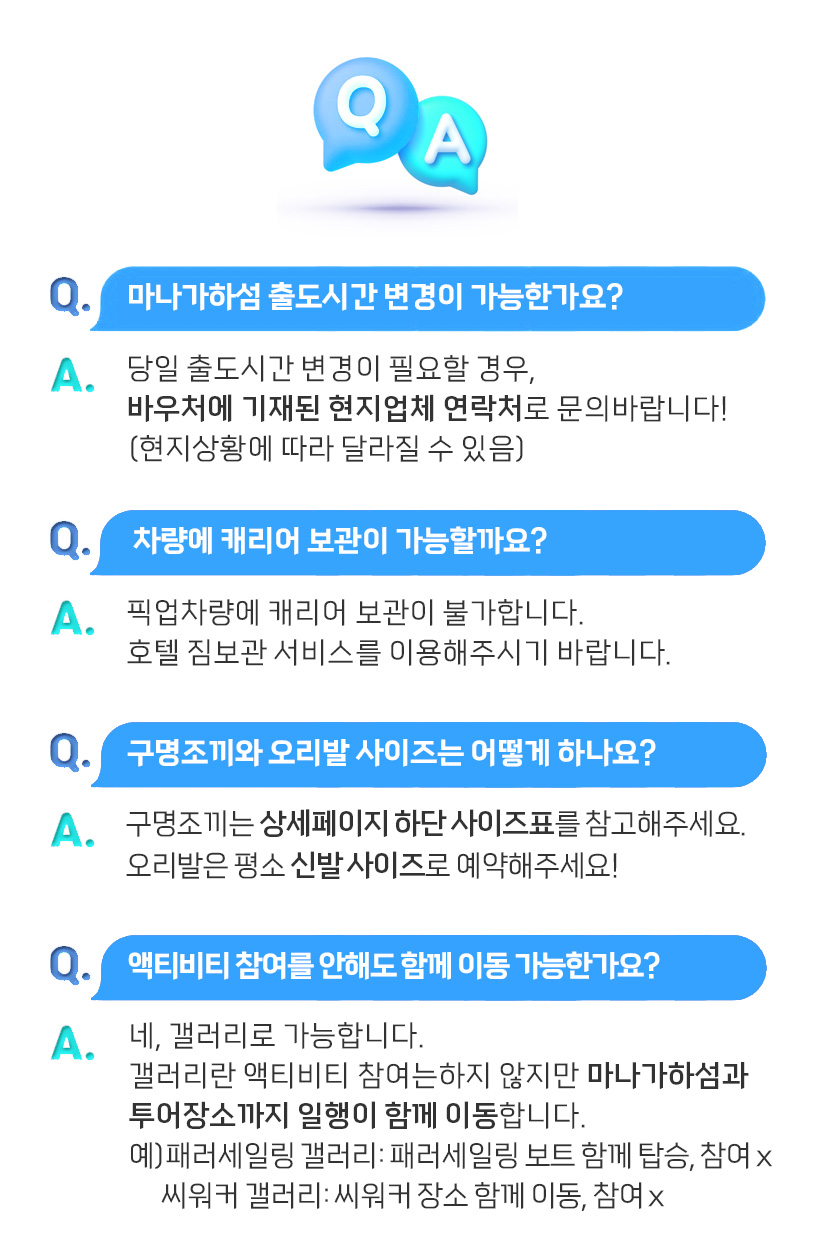 태평양의 햇빛은 정말 강렬합니다..!! 살이 빨개질 수 있으니 래쉬가드는 꼭 챙겨가시는게 좋습니다. 스케줄의 혼동이 있었군요, 현지에 확인 해보고 이 부분 전달 후 개선할 수 있도록 하겠습니다. 불편을 드려 죄송합니다ㅜㅜ