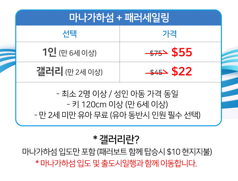 * 11월 1일부터 갤러리 이용객이 패러보트 함께 탑승시 $10 추가금이 발생합니다.(현장결제)